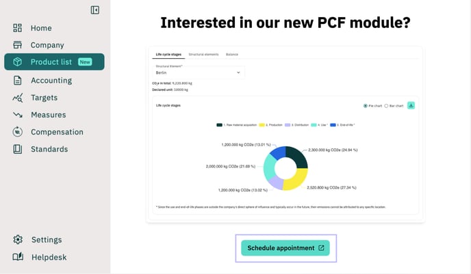 With this release, the product list is now also available to our CCF customers in the side navigation. With just one click, you can easily book an appointment with our Sales team and learn more about the Product Carbon Footprint.