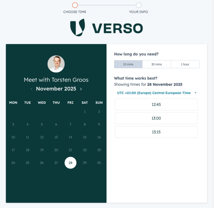 After clicking, the calendar of one of our Sales colleagues will open. There, you can simply choose a 15-, 30-, or 60-minute time slot and book the appointment directly.