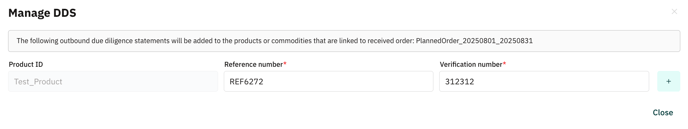- Option 2 - Manual Upload: Click on Add DDS and and enter the missing DDS reference number and verification number for the ordered product. By clicking on the "+" symbol it will save the assigned DDS reference and verification number and it will open up a new row in case you want to add multiple DDS numbers for the same ordered product.